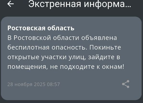 Утром 28 ноября в Ростовской области объявили беспилотную опасность. Жителям рекомендовано соблюдать меры предосторожности после перехватов БПЛА и повреждений в Шахтах и Таганроге. Без пострадавших.