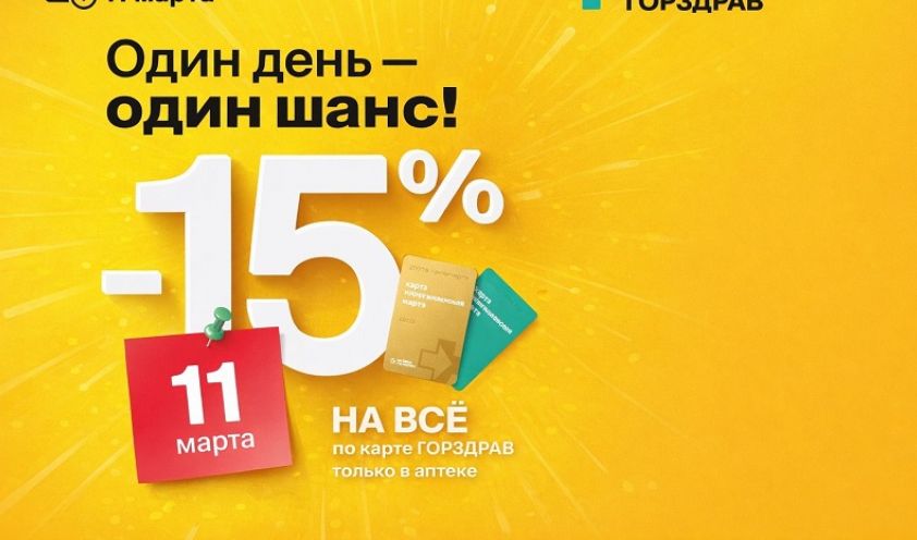 11 марта в сети аптек «ГОРЗДРАВ» пройдет акция «ОДИН ДЕНЬ — ОДИН ШАНС»! Приобретите скидку 15% на весь ассортимент. Это выгодная акция для крупной аптечной сети, такой как «Горздрав». ПОЭТОМУ ИСПОЛЬЗУЙТЕ этот шанс! Срок акции: 11 марта. Информацию об организаторе акции, сроках, правилах, месте, количестве, порядке получения и иные подробности уточняйте в аптеках «Горздрав». Реклама. ООО «АПТЕКА-А.В.Е». ИНН 7705947629. Erid: 2Vfnxvn27yb
