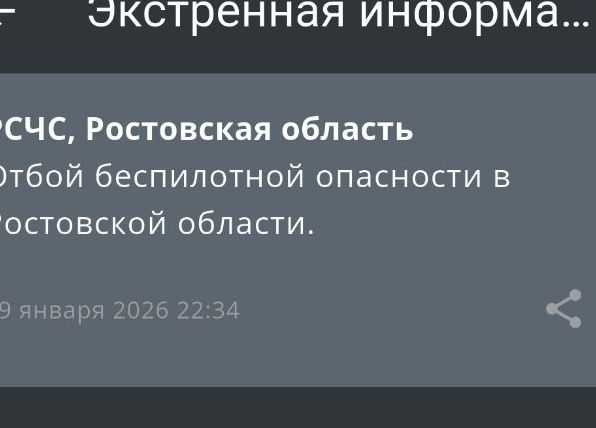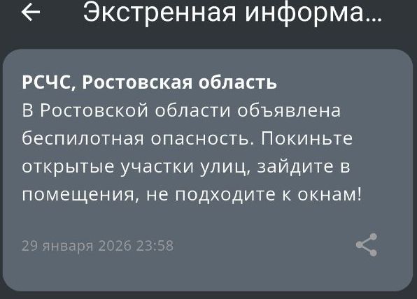 В Ростовской области 29 января вечером была снята угроза падения БПЛА. Жителям рекомендовали соблюдать меры предосторожности.
