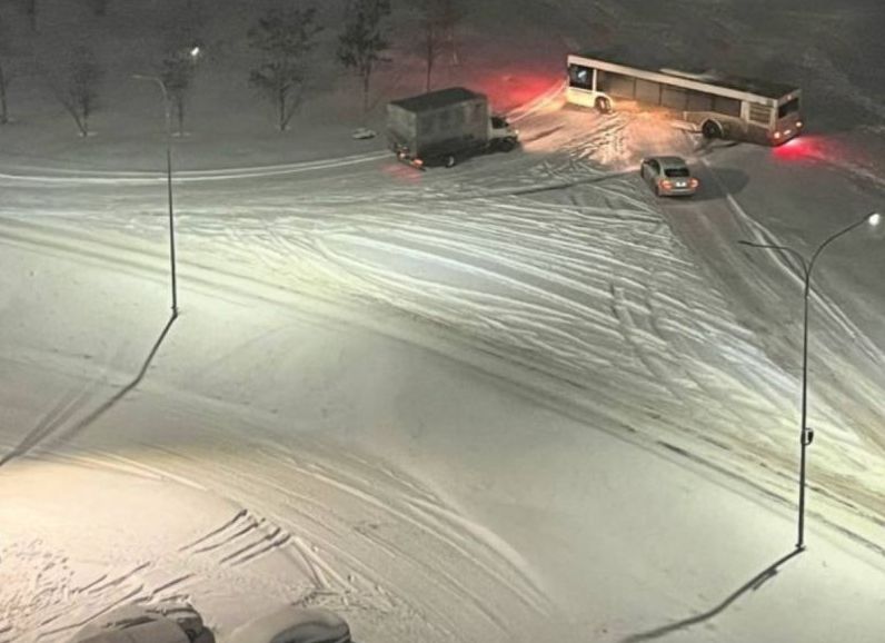 Снегопад в Ростове привел к застреванию автобуса в Суворовском. Жители пытаются его вызволить.