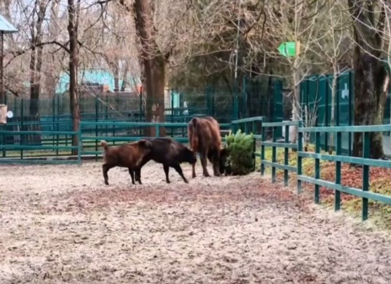 После новогодних праздников в Ростовский зоопарк прибыли нераспроданные ели. Животные, особенно зубры, с удовольствием играют с ними, получая витаминное лакомство.