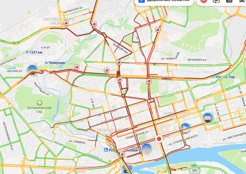 Пробки в Ростове достигли максимальных значений — десяти баллов после мощного снегопада, начавшегося 2 февраля. Движение на ключевых улицах города практически остановилось до вечера.