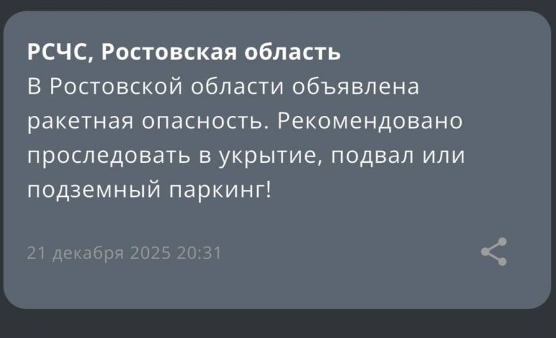 В Ростовской области вечером 21 декабря объявлена ракета-опасность. Жителей просят немедленно воспользоваться укрытиями.