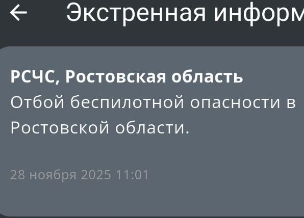 Угроза падения дронов в Ростовской области была объявлена утром 27 ноября и отменена спустя четыре часа. Было уничтожено одно летательное средство.