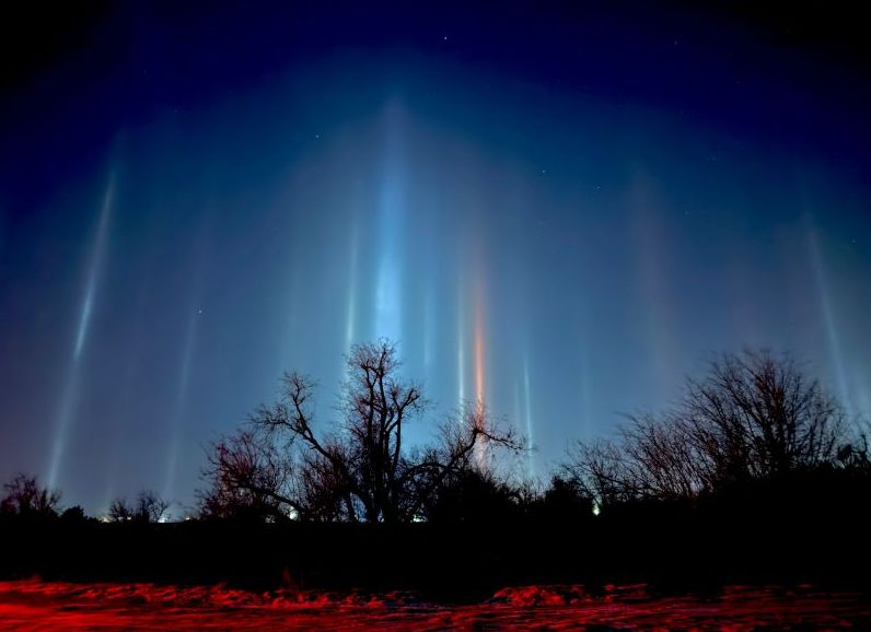 Жители Ростовской области запечатлели необычные световые столбы, образовавшиеся в небе 16 января в Красном Сулине. Эксперты объясняют это оптическим явлением, вызванным преломлением света через ледяные кристаллы.