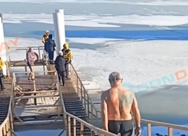 Волгодонск: несмотря на сильные крещенские морозы, жители продолжают традиции купания в Цимлянском водохранилище, под присмотром спасателей и полиции.