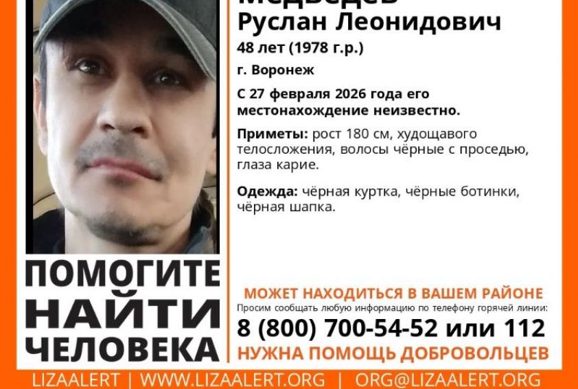 Волонтеры поисково-спасательного отряда «ЛизаАлерт» ищут 48-летнего Руслана Медведева, пропавшего в Воронеже 27 февраля. Просьба о помощи и информации по телефону 88007005452.