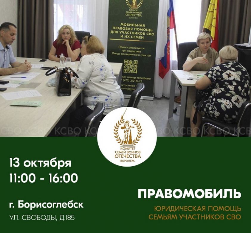 Юридическая помощь семьям участников СВО была оказана в Борисоглебске в рамках проекта «ПравомобильКСВО» при поддержке Фонда Президентских грантов.
