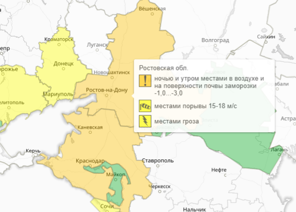 В Ростовской области введен оранжевый уровень погодной опасности в связи с неблагоприятными метеорологическими условиями. Данные Гидрометцентра свидетельствуют о значительном понижении температуры воздуха. Метеорологи прогнозируют минимальную температуру от 0 до -3 градусов Цельсия. Неблагоприятные условия, в частности, заморозки, ожидаются до утра 9 апреля, и будут наблюдаться в некоторых районах донского региона, преимущественно ночью и утром. Кроме того, специалисты ввели желтый уровень погодной опасности, связанный с грозой и сильным ветром. Прогнозируется, что грозовое явление будет продолжаться до шести вечера 8 апреля. В отдельных районах региона порывы ветра могут достигать 15-18 метров в секунду. В связи с сложившейся ситуацией, жителям рекомендуется ограничить выходы из зданий. При низких температурах необходимо обеспечить дополнительный тепловой комфорт. Также рекомендуется избегать укрытия под высокими деревьями и находиться на безопасном расстоянии от металлических конструкций.