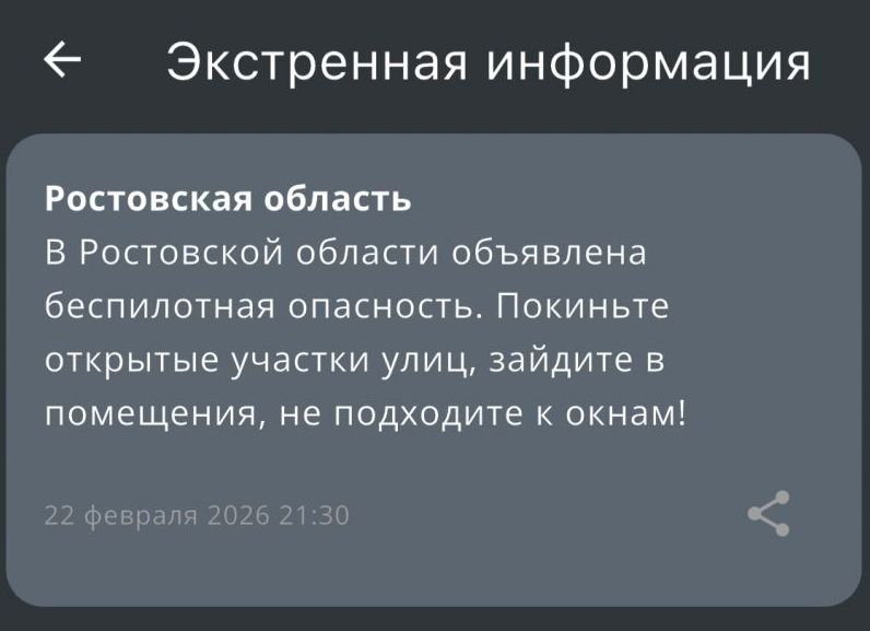 Ночью 22 февраля в Ростовской области введен режим повышенной готовности. Жителям региона были даны рекомендации по безопасности. Согласно информации, предоставленной МЧС России (РСЧС), населению рекомендуется оставаться в помещении и избегать нахождения вблизи окон. Эта мера была предпринята после сообщений от мониторинговых каналов, которые ранее предупреждали об угрозе, связанной с беспилотными летательными аппаратами, для городов Гуково, Красный Сулин, Новошахтинск и близлежащих населенных пунктов.