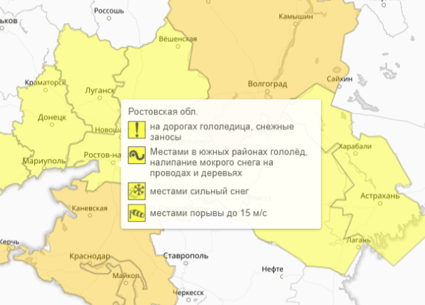 В Ростовской области введен желтый уровень погодной опасности из-за непогоды. Об этом свидетельствуют показатели синоптиков Гидрометцентра. В ближайшие дни метеорологи прогнозируют метель. Сильный снегопад ожидается в некоторых районах донского региона до 6:00 3 февраля. Помимо этого, в области будет наблюдаться сильный ветер. Местами его порывы достигнут 15 метров в секунду. Действие предупреждения — с 18:00 2 февраля до 6:00 3 февраля. Вдобавок в регионе ожидаются гололедно-изморозевые явления. На проезжих частях будет наблюдаться гололед со снежными заносами, а на проводах и деревьях — налипание мокрого снега. Людям следует быть осторожными на улицах до 18:00 4 февраля. В связи с непогодой автовладельцам рекомендуется снижать скоростной режим и не совершать резких маневров, а пешеходам — внимательно следить за дорожной обстановкой и переходить проезжую часть в разрешенных для этого местах. Фото: Гидрометцентр