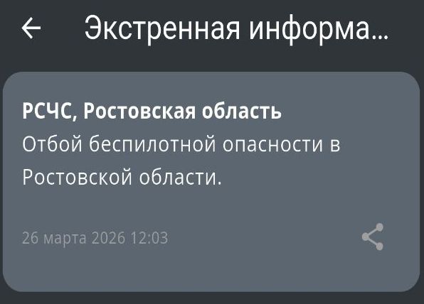 В Ростовской области днем 26 марта отменили режим беспилотной опасности. Оповещение РСЧС было выдано около 12:00. Беспилотная опасность в донском регионе была объявлена около 11:30. Жителям рекомендовали покинуть открытые участки улиц, зайти в помещения и отойти подальше от окон. Через полчаса оперативные службы отменили беспилотный режим. Официальной информации по сбитым БПЛА не поступало.