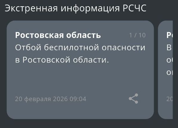 В Ростовской области отменили режим повышенной готовности, связанный с угрозой беспилотных летательных аппаратов. Предупреждение от региональной службы по чрезвычайным ситуациям поступило около 9:00. Специальный режим был введен 20 февраля. В указанный период жителям рекомендовалось находиться в безопасных помещениях, вдали от открытых пространств и окон. Через час, после оперативных действий, режим повышенной готовности был снят. По данным губернатора Ростовской области, беспилотные аппараты были нейтрализованы в Каменске-Шахтинском. Сообщения о жертвах или материальных потерях не поступали.