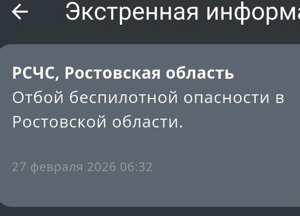 Утром 27 февраля в Ростовской области был отменен режим беспилотной опасности. О предупреждении сообщили около 6:30. Ранее, примерно в 2:30, в регионе был введен режим беспилотной опасности. Жителям рекомендовалось покинуть открытые участки улиц, укрыться в зданиях и держаться подальше от окон. Оперативные службы утром прекратили действия по ликвидации угрозы, связанной с беспилотниками.