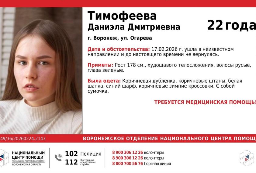 В Воронеже продолжаются поиски 22-летней Даниэлы Тимофеевой. В областном центре полиция и волонтеры работают над установлением ее местонахождения. С 17 февраля девушка не выходит на связь с родными. В последний раз ее видели на улице Огарева 25 февраля. После этого она ушла в неизвестном направлении. По информации поисковиков, девушка может нуждаться в медицинской помощи, поэтому ее исчезновение может быть опасным для жизни. Рост разыскиваемой составляет 178 сантиметров. У нее худощавое телосложение, русые волосы и зеленые глаза. Особые приметы внешности отсутствуют, поэтому ориентироваться предстоит в первую очередь на одежду, в которой девушка была в день исчезновения. На момент ухода Даниэла была одета в коричневую дубленку, такого же цвета штаны и зимние кроссовки. Голову покрывала белая вязаная шапка, шею — синий шарф. При себе у девушки была сумочка. Всех, кому что-либо известно о нынешнем местонахождении девушки, видевших ее после 17 февраля или располагающих любой информацией, которая может помочь в поисках, просят незамедлительно сообщить об этом в полицию или обратиться к волонтерам. Даже самый незначительный на первый взгляд факт может оказаться решающим для скорейшего возвращения пропавшей домой.