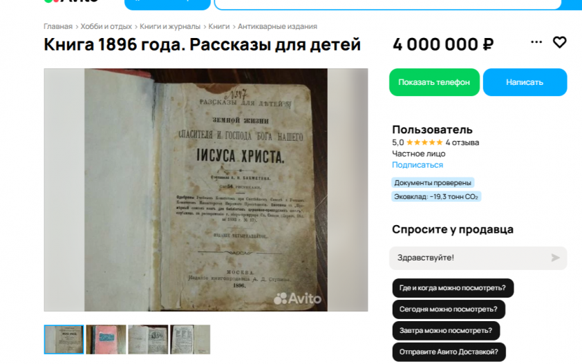 На популярном сайте бесплатных объявлений в Воронеже появился лот, который может привлечь внимание коллекционеров и религиоведов. Некий пользователь выставил на продажу книгу «Рассказы для детей о земной жизни Иисуса Христа» за 4 миллиона рублей. В описании товара автор объявления уверяет, что экземпляр датируется 1896 годом. Состояние книги оценивается как «б/у», однако столь высокая стоимость, вероятно, объясняется именно возрастом издания и раритетностью. Продавец отмечает, что готов обсуждать цену: в карточке товара указано, что он согласен на торг. На данный момент неизвестно, есть ли у лота документальное подтверждение подлинности и столь раннего года выпуска.